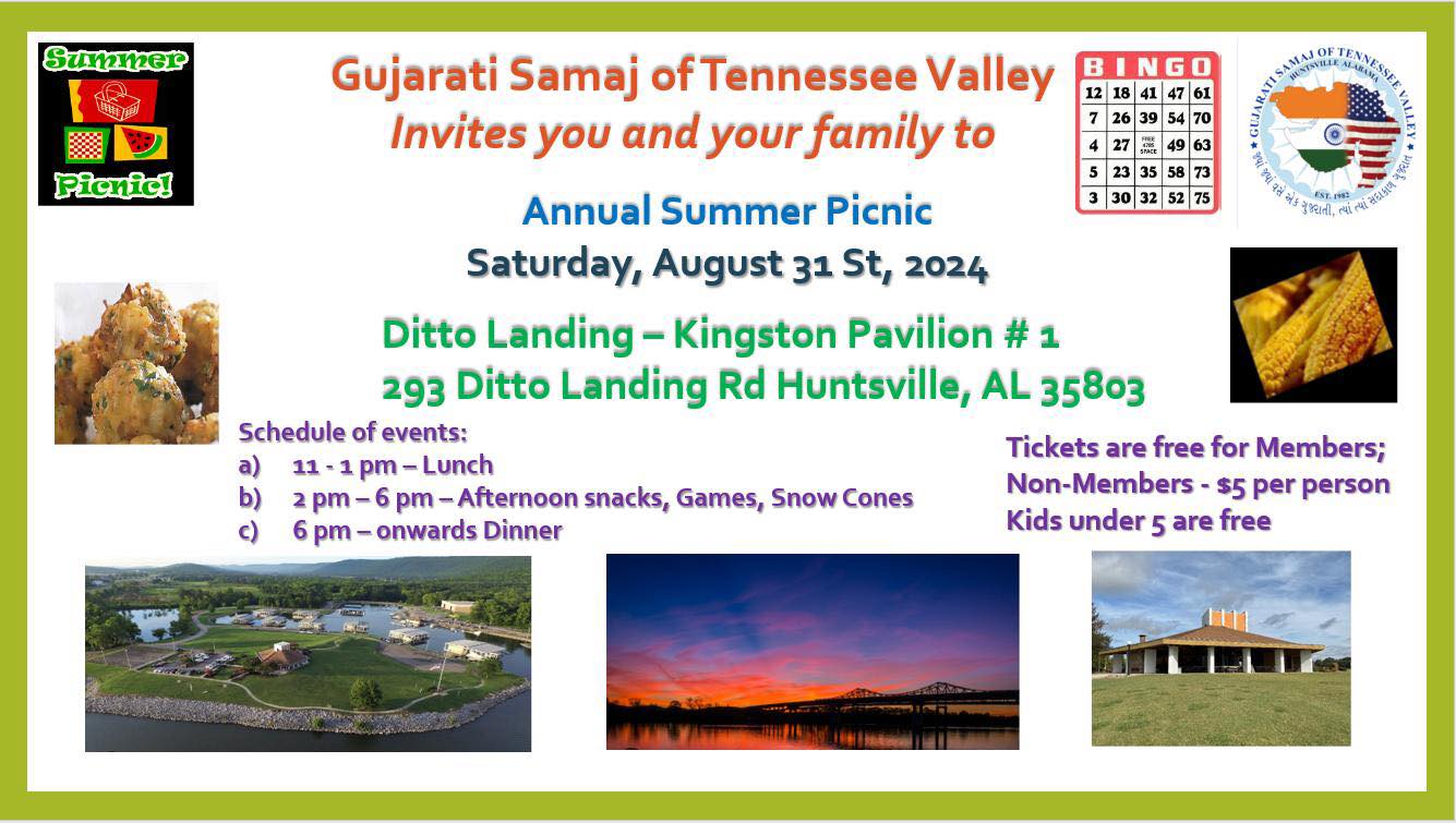 Gujarati Samaj of Tennessee Valley invites you and your family to the Annual Summer Picnic on Saturday, August 31st, 2024.