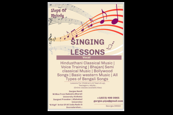 Singing lessons offered by Gargi Nandi, focusing on Hindustani classical music, voice training, Bollywood songs, and more.
