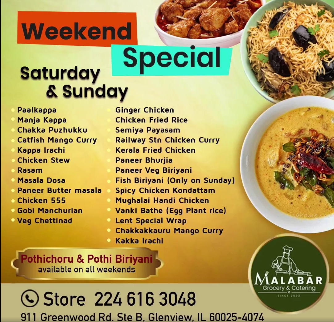 Join us this Saturday and Sunday to savor our mouthwatering food varieties! From tantalizing appetizers to savory main courses, we have something to delight every palate. Don't miss out on this culinary experience - visit Malabar Foods and indulge in our delectable specials!