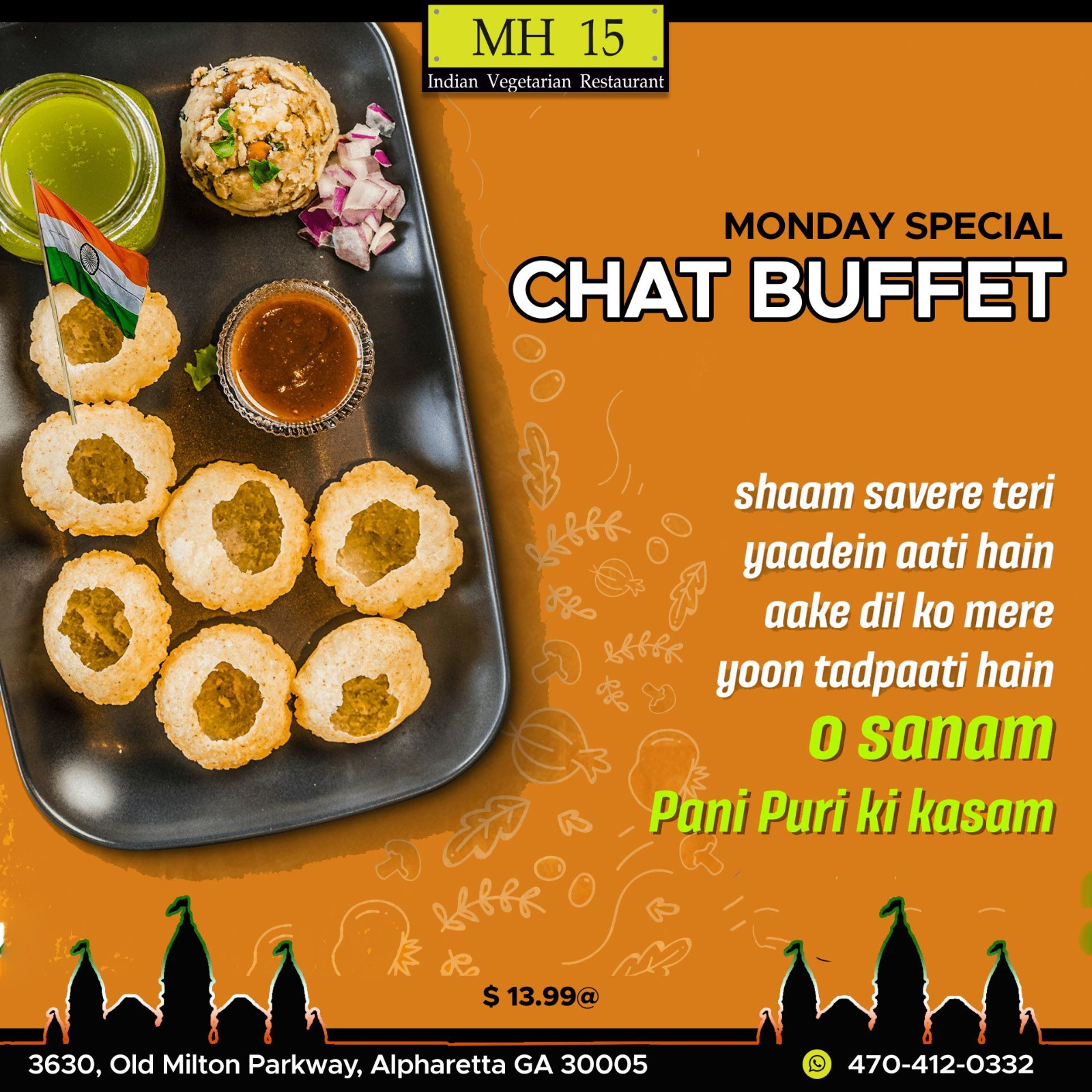 Join us at Mh15 Indian Vegetarian Restaurant for a mouthwatering Monday Special Chat Buffet, featuring over 20 delectable items at just $13.99! ???????? Taste the authentic flavors of Desi Pani Puri and Vada Pav ka Swaad Videsh me.