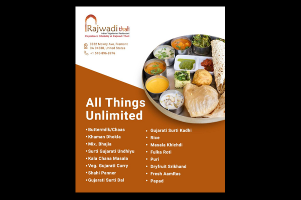 Rajwadi Thali, Chaat & Sweets is an ALL-YOU-CAN-EAT Indian Gujarati 100% Vegetarian Restaurant.