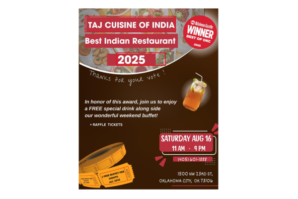Taj serves succulent Indian and Chinese dishes which have been influenced by the diverse cuisines of Gods own country Kerala. With decades of experience in the culinary industry our chefs have developed an innovative and comprehensive menu with traditional ingredients and dishes from all of the regions of India. Our Menu includes Vegetables, meat and seafood dishes cooked in Indian masala to perfection and guarantees to bring the tradition and taste of India right to the heart of Oklahoma City in every bite.Taj team welcomes you all for a great dining experience.