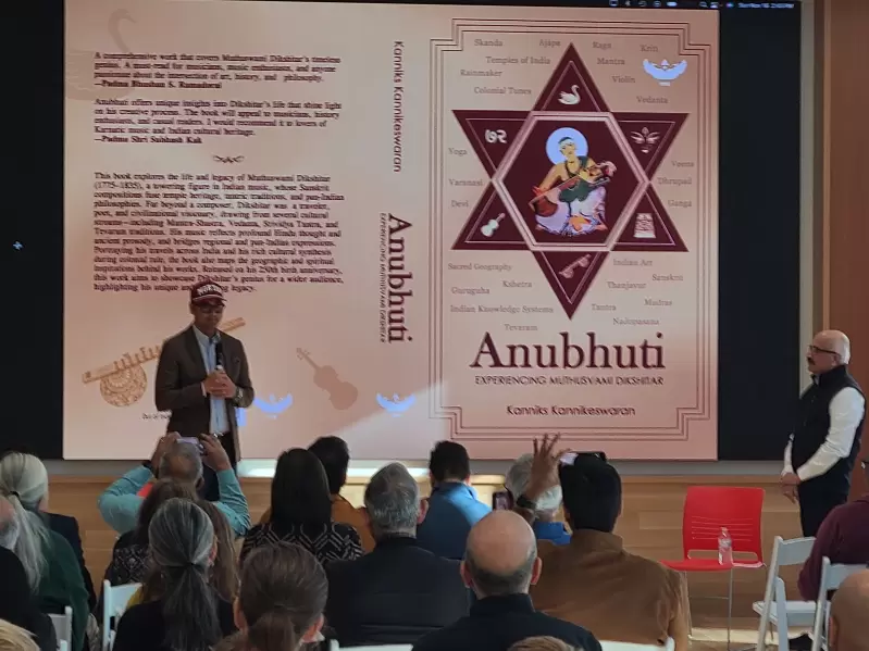 Aftab Pureval, the Indian-origin mayor of Cincinnati, released Dr. Kanniks Kannikeswaran’s book ‘Anubhuti – Experiencing Muthusvami Dikshitar’ at the Cincinnati Art Museum on Nov. 16, marking the hometown stop of the book’s ongoing tour.