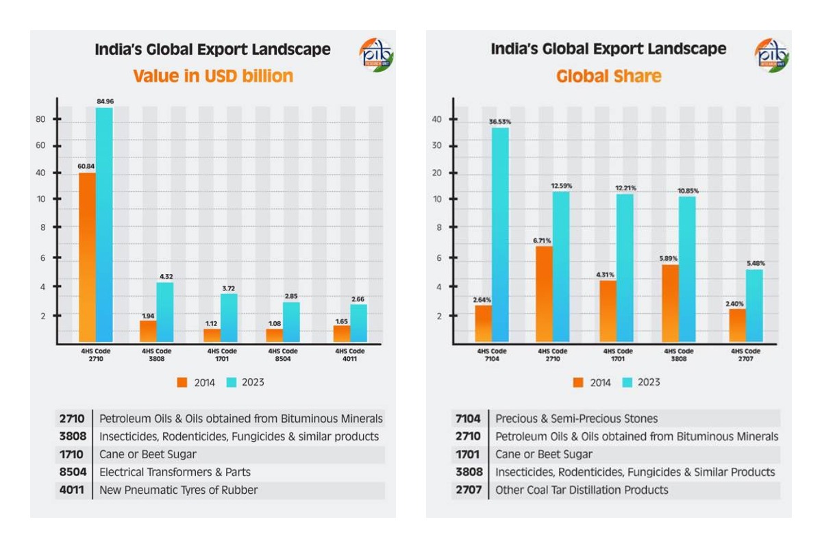 Export values in these categories have crossed $1 billion in 2023, with India maintaining or improving its global rankings among top suppliers.