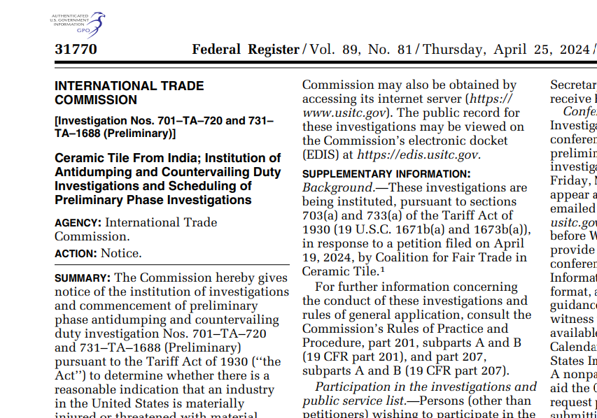 The Department of Commerce has initiated investigations in response to the petition. If the findings support the allegations of unfair competition, the US government may impose tariffs on Indian tile imports.