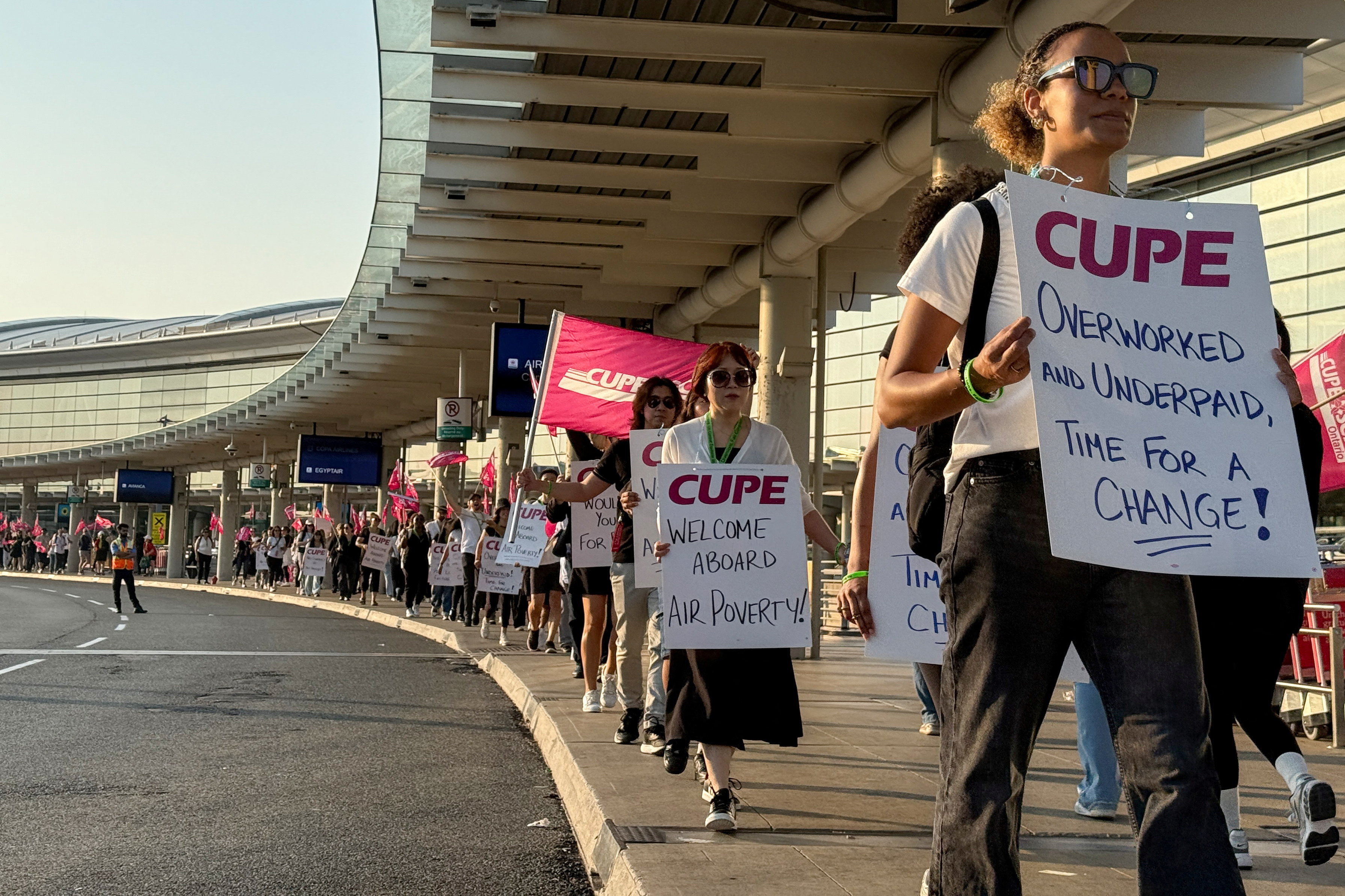 Outside Toronto Pearson International Airport - the country's busiest - hundreds of cabin crew waved flags, banners and picket signs. Union officials called on members to assemble outside all of the country's major airports, including in Toronto, Montreal, Calgary and Vancouver.