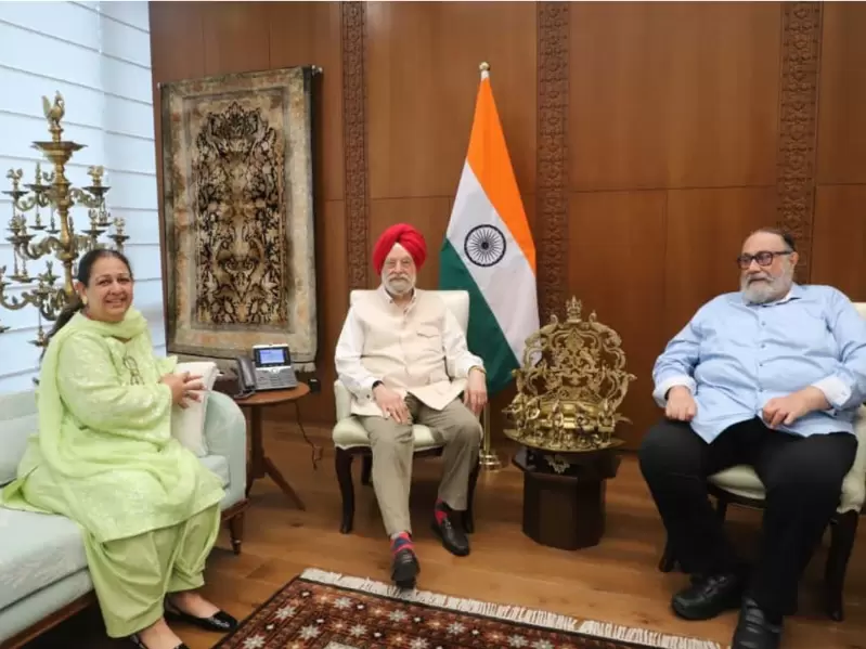 Mandeep Chadha and Baljit Singh Chadha flanking Indian minister Hardeep S Puri in New Delhi. / Baljit Singh Chadha