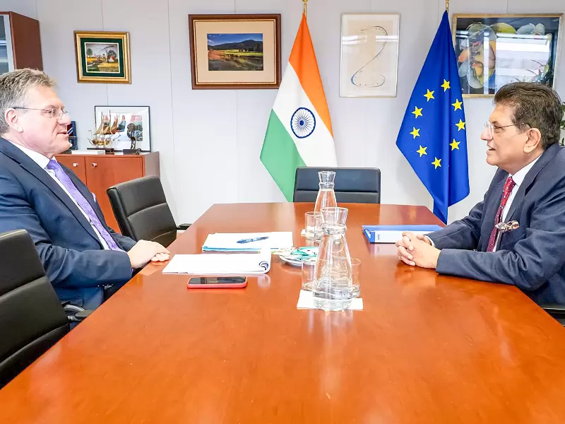 Union Minister for Commerce and Industry Piyush Goyal holds high-level talks with EU Trade and Economic Security Commissioner Maros Sefcovic on the proposed India–EU Free Trade Agreement, in Brussels on Friday, January 9, 2026. / IANS/X/@PiyushGoya