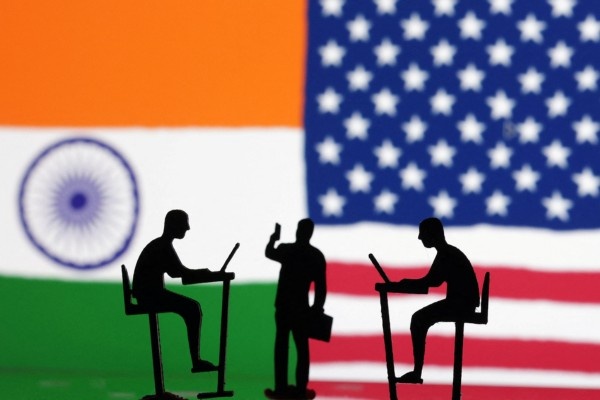 FILE PHOTO: The Indian flag, the U.S. flag and people miniatures, some with laptops, are seen in this illustration taken March 10, 2024. / REUTERS/Dado Ruvic/Illustration