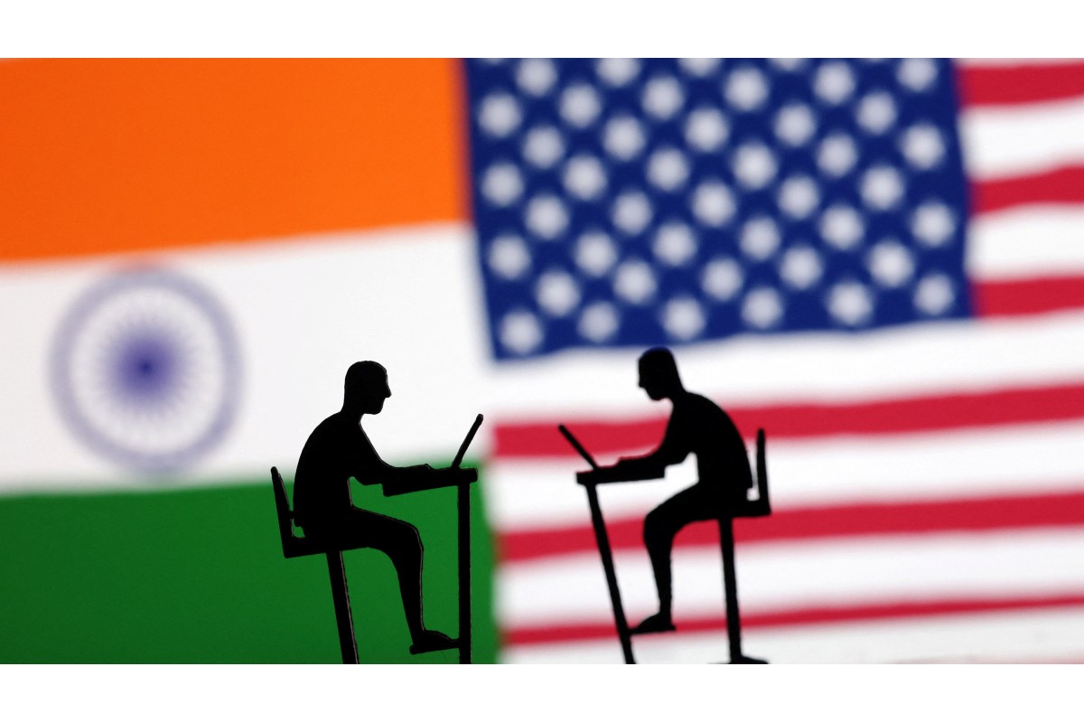 The Indian flag, the U.S. flag and people miniatures with laptops are seen in this illustration taken March 10, 2024. / Reuters/Dado Ruvic