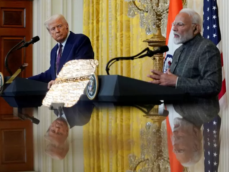 U.S. President Donald Trump and Indian Prime Minister Narendra Modi are pictured in a mirror as they attend a joint press conference at the White House in Washington, D.C., U.S., February 13, 2025. / REUTERS/Nathan Howard
