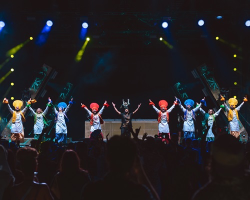 For their Coachella appearance, Indo Warehouse collaborated with creative teams High Scream and Frameworx for a large-scale, eye-catching, on-stage production. The original music, striking stage design, immersive storytelling visuals, and dance choreography included more than 25 performers spanning two sets of dance teams (including two regional South Asian folk dance styles—Bhangra and Raas), drummers, and multiple vocalists. Anvaya, composed of singer and songwriter Sonia, and producer and multi-instrumentalist Kaushal, dance teams Raas Ruckus and Baaghi Bhangra, singers HYDR and PDNY, and drummer Nihal Singh and his dhol drumline.