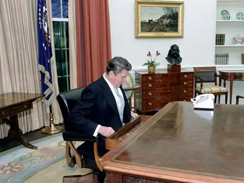 Ronald Reagan sits at the Oval Office desk following his inaugural parade in Washington, D.C., U.S. in January 1981. / Ronald Reagan Presidential Library/Handout via REUTERS