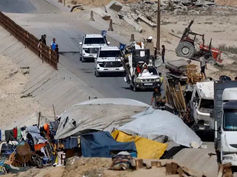 United Nations vehicles drive on a road as displaced Palestinians, fleeing northern Gaza due to an Israeli military operation, move southwards following Israeli forces' orders to leave Gaza City, in the central Gaza Strip October 3, 2025. / REUTERS/Mahmoud Issa