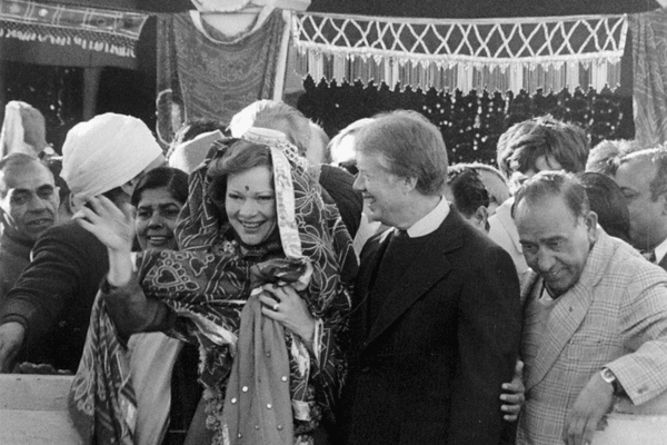 Rosalynn, dressed in traditional attire, laughing, as Carter stood beside her surrounded by a crowd of villagers. / @USAmbIndia