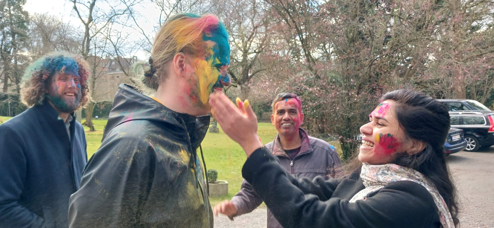 RangBarse Edinburgh hosted celebrations featuring colors, music, dance, and unity. / Cambridge's Hindu students gathered at Parker's Piece for a vibrant celebration hosted by the Cambridge University Hindu Cultural Society. The festivities included playing with colors, traditional music and dance, cultural performances, delicious Indian sweets, and a joyful atmosphere of unity and festivity.