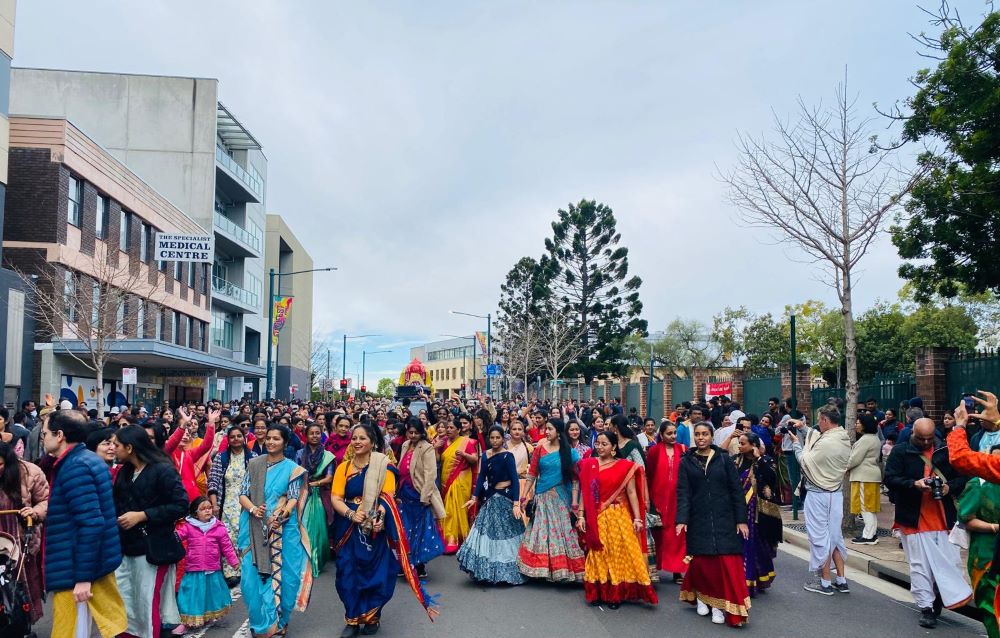 Devotees taking part in the Chariot festival in Sydney. / Saraswati SinghThe idols of Balarama, Subhadra, and Jagannath were assembled in the chariot following a comprehensive ritual of worship. Devotees began to pull the chariot as they chanted Jai Jagannath and Har Krishna Hare Ram. With boundless energy, the Bhajan group from the ISKCON temple sang the Lord's name. As if they were the Gopis of Vrindavan, women dressed traditionally in Indian garments danced before the chariot.