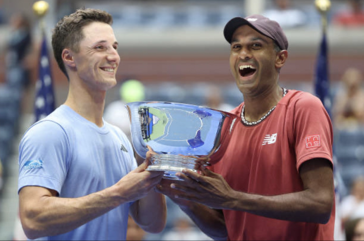 Photo caption: Rajeev Ram (right) and Joe Salisbury hold their winning trophy at the 2023 US Open. / (photo courtesy of Rajeev Ram)