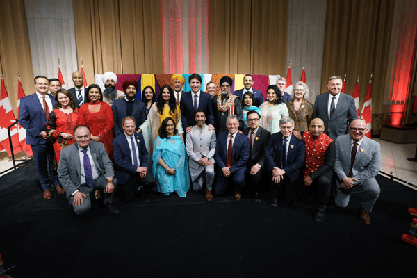 Justin Trudeau attending a Vaisakhi celebration with Sikh Canadian lawmakers in 2024. / X/@randeepssarai