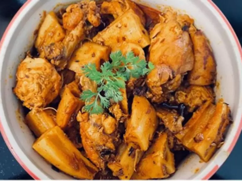 11. Cook for about 5 minutes, or until the water is absorbed and the chicken and nadur are coated with an oily masala (spice mixture).