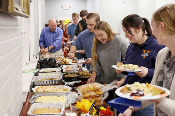 Chemical engineering students line up for food Wednesday evening at the annual Thanksgiving dinner for the students enrolled in the major, held at Thornton Hall. / Image- Matt Riley, University Communications