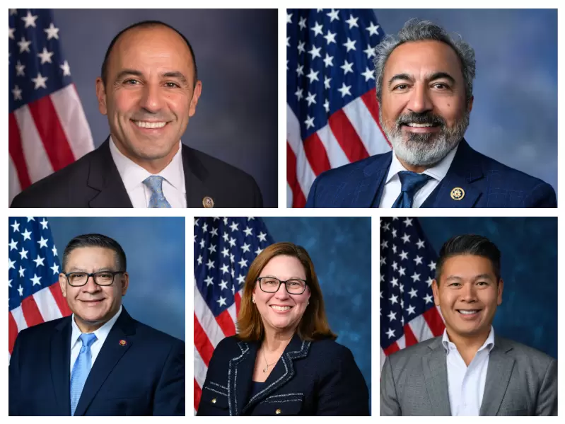 Clockwise--Jimmy Panetta, Ami Bera, Derek Tran, Julie Johnson and Salud Carbajal. / Wikipedia