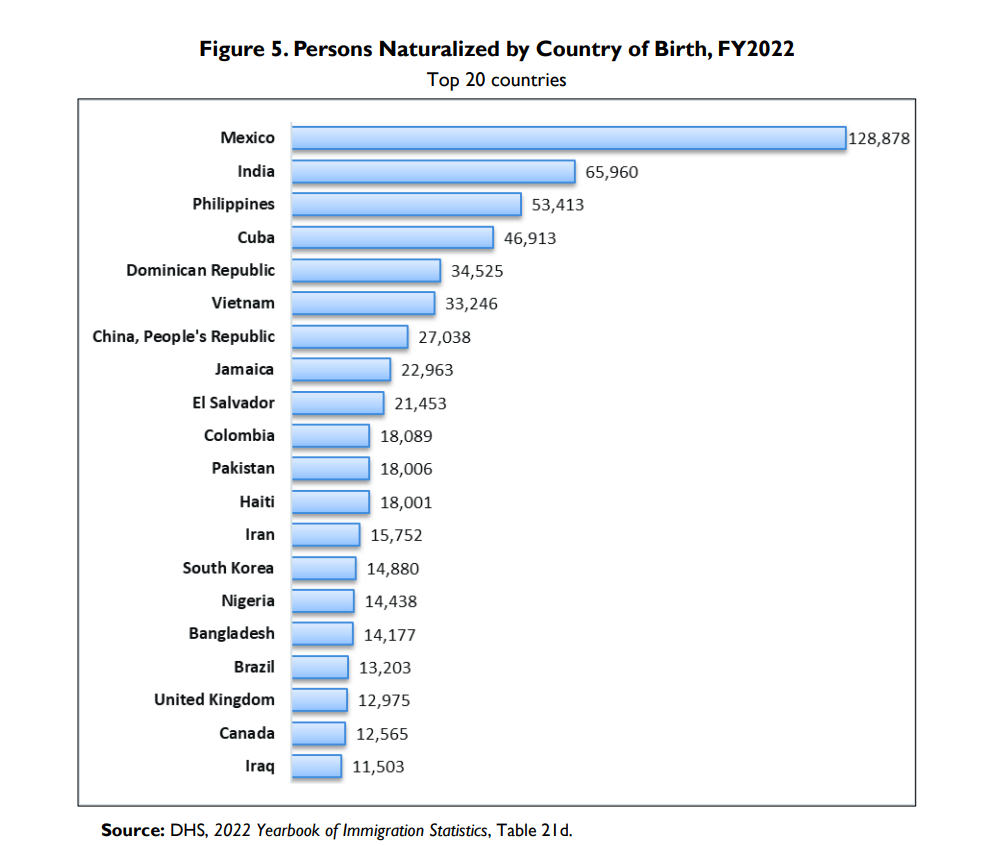 CRS said in 2023, 878,500 new US citizens naturalized. Based on the latest available data, CRS said in 2022, as many as 128,878, Mexican nationals became American citizens. They were followed by Indians (65,960), the Philippines (53,413(, Cuba (46,913), Dominican Republic (34,525), Vietnam (33,246) and China (27.038).