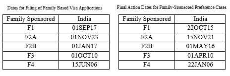 Family-Sponsored Preference Cases Specific for Indian Nationals / USCISFamily-based First Preference Category (F-1 – Unmarried Sons and Daughters of U.S. Citizens): India’s visa cut-off date will remain on September 1, 2017.