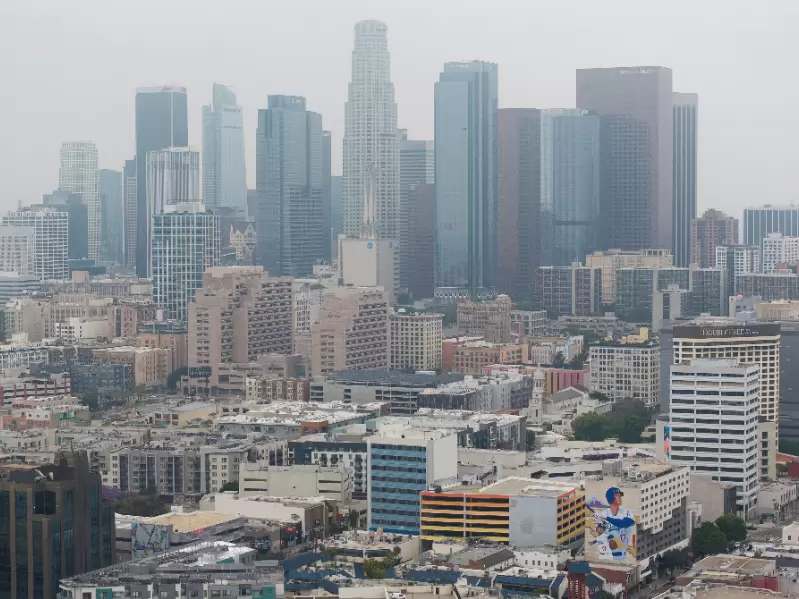 An drone view shows the city skyline following protests against federal immigration sweeps in Los Angeles, California, U.S. June 10, 2025. / REUTERS/David Ryder