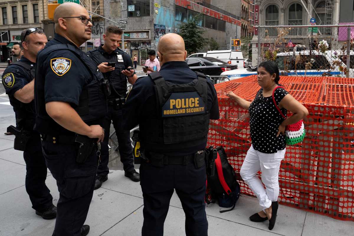 A migrant woman speaks with Homeland Security agents about how to self deport, after her husband was detained by Immigration and Customs Enforcement (ICE), in New York City, U.S., August 14, 2025. / REUTERS/David 'Dee' Delgado