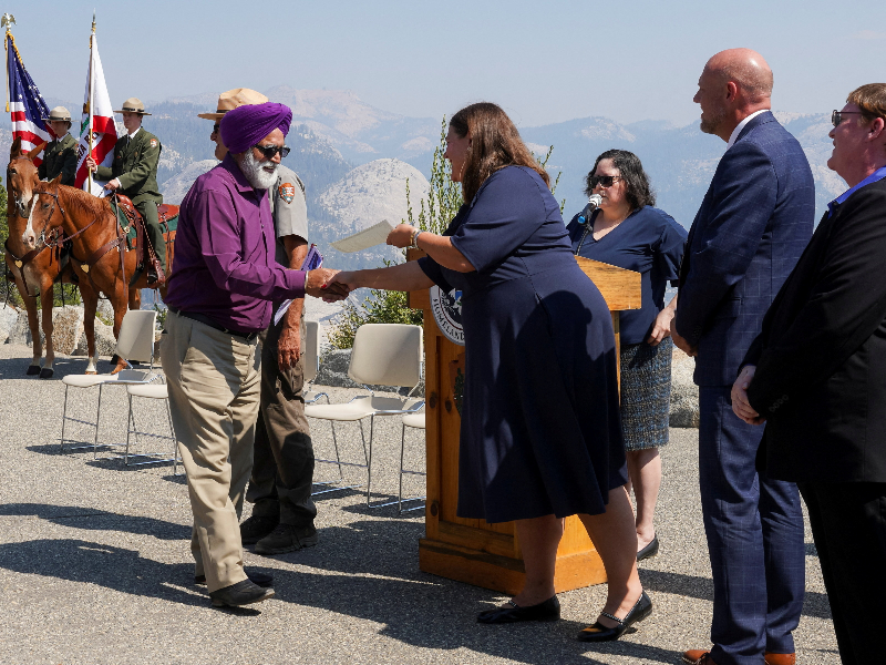 Melissa W. Maxim shakes hands and offers a Certificate of Citizenship to a new American citizen at the Glacier Point amphitheater in Yosemite National Park, California, U.S., September 17, 2025. / REUTERS/Tracy Barbutes/File Photo
