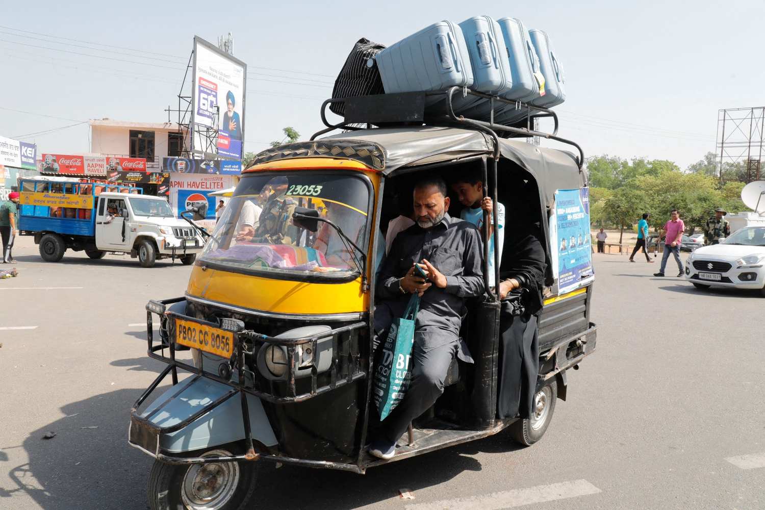 People sit inside an autorickshaw as they commute towards the Attari-Wagah crossing on the India-Pakistan border near Amritsar, following Tuesday’s attack on tourists near south Kashmir’s scenic Pahalgam, India, April 25, 2025. / REUTERS/Pawan Kumar