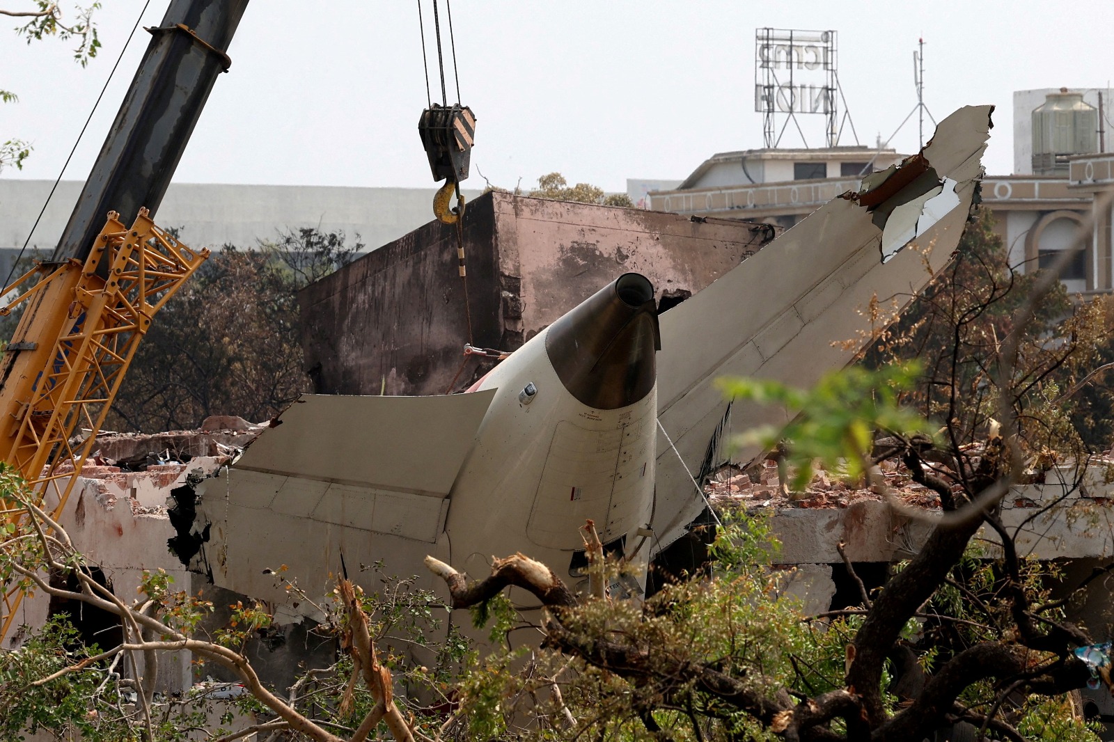 A crane removes the wreckage of the Air India Boeing 787-8 Dreamliner aircraft, which crashed during take-off from an airport, in Ahmedabad, India June 14, 2025. / REUTERS/Amit Dave