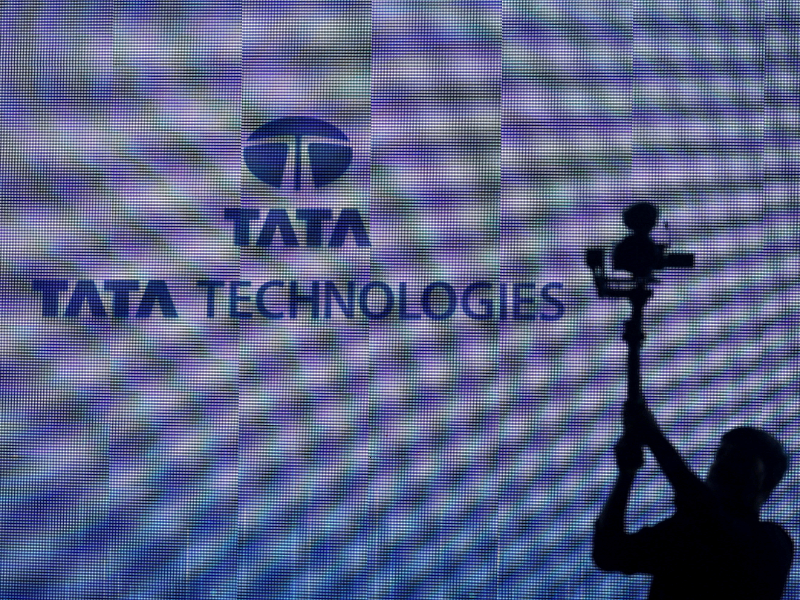 A cameraman works in front of the Tata Technologies logo in Mumbai, India, October 8, 2024. / REUTERS/Francis Mascarenhas