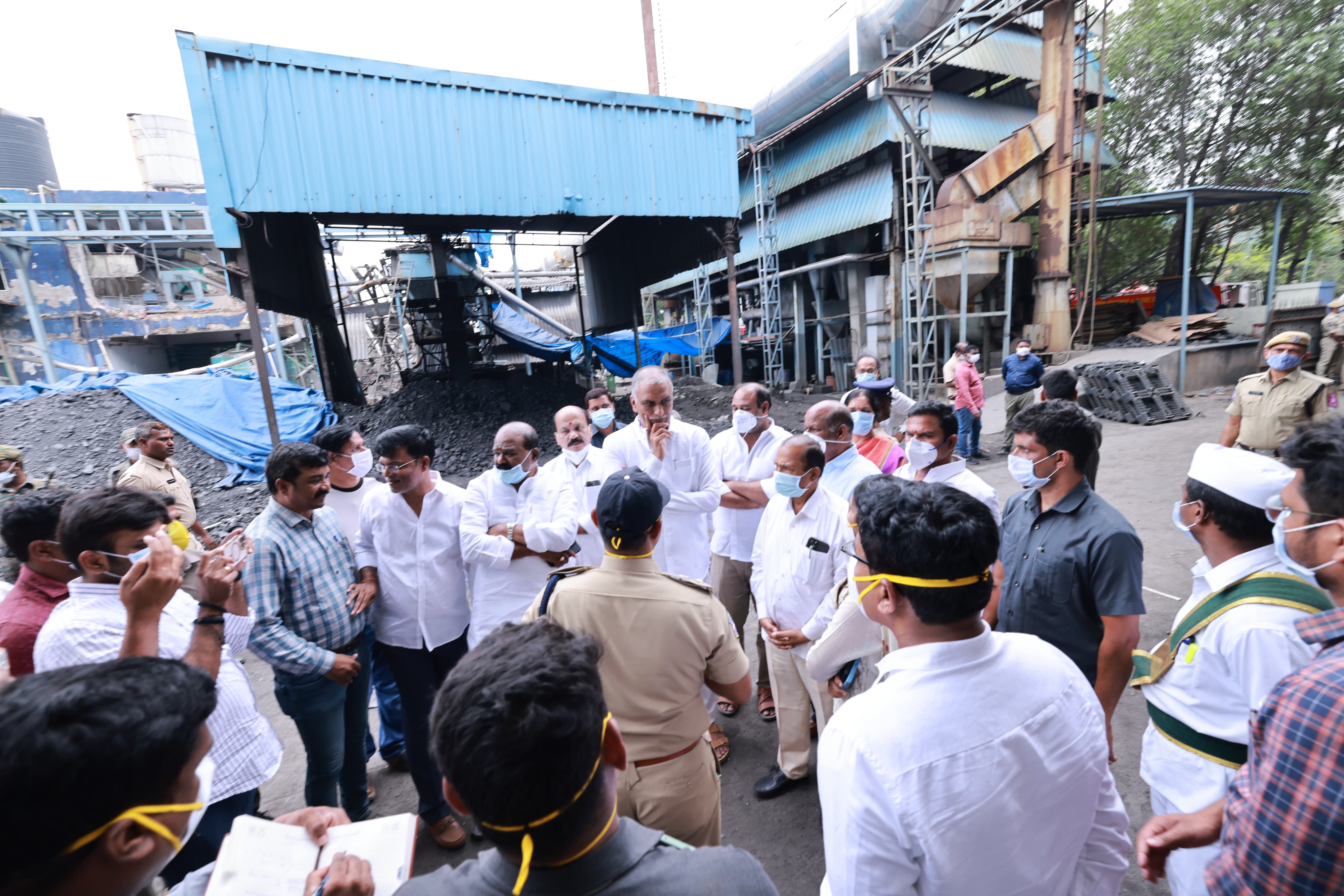 Former Minister and MLA Harish Rao Thanneeru, along with other leaders, visited the site of the fire accident that occurred in the Pasamailaram industrial area of Sangareddy district. / X/ BRSparty