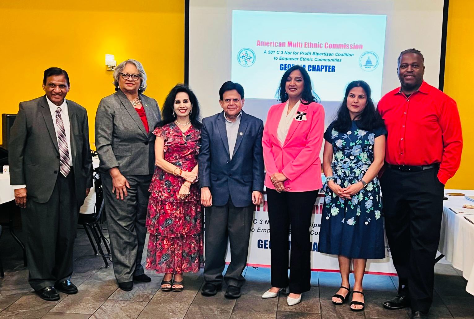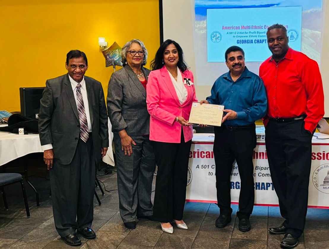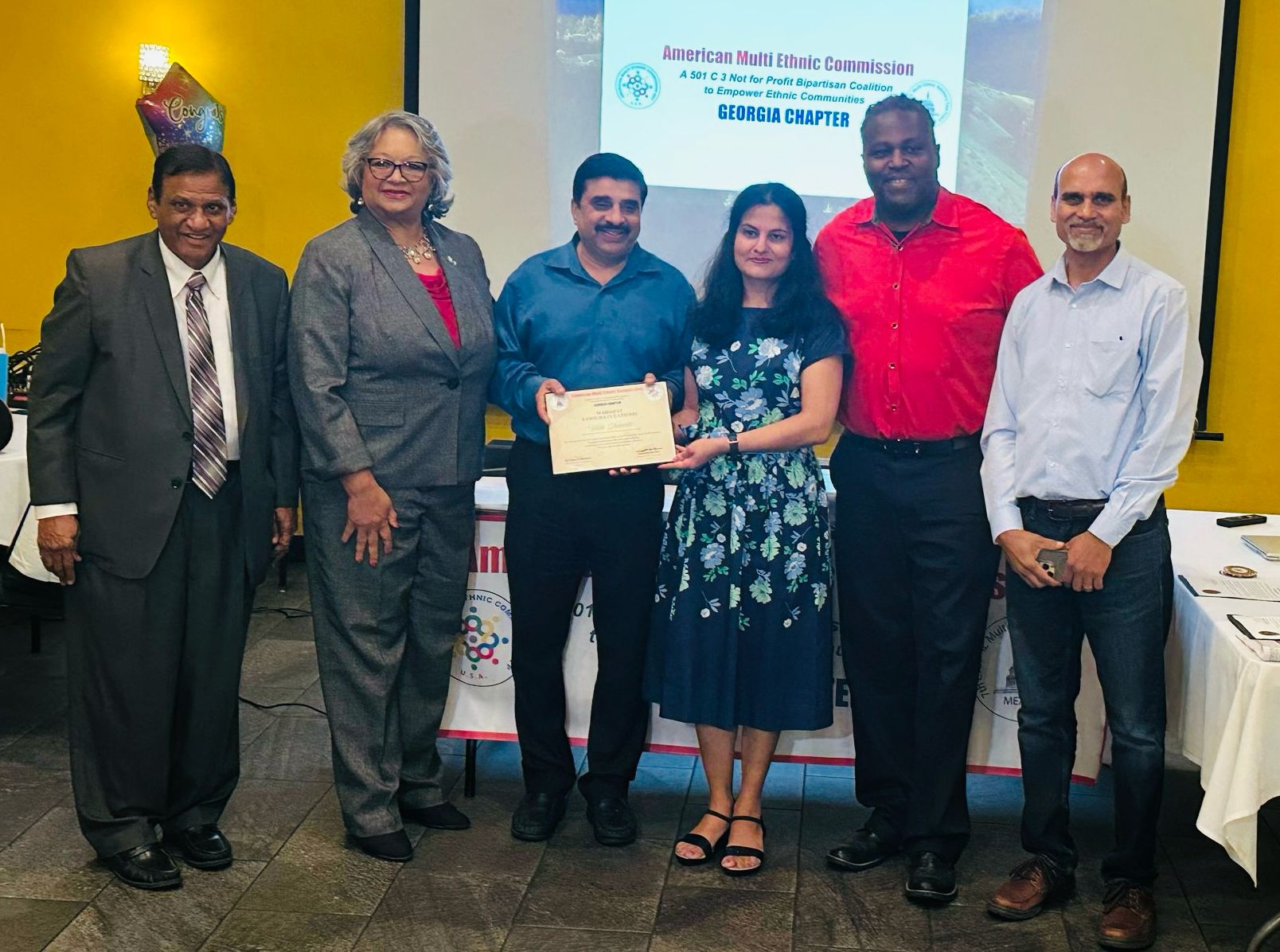 The community event held at the Madras Chettinad restaurant in Atlanta brought together prominent community leaders and well-wishers including Dr. Subrahmanya Bhat, founder and chairman of AKMG; Annapurna Bhat, president of the Georgia Karnataka Doctors Association; Cynthia Edwards, Rotary District Governor and former AMEC awardee; Deronte Smith, co-chair of AMEC Georgia and Nikita Shah Kothari, chairperson of the JITO Ladies Wing (JLW) Atlanta chapter.