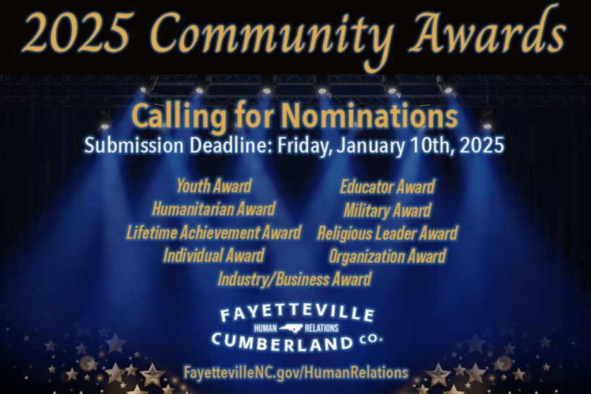 The Fayetteville-Cumberland Human Relations Commission is now accepting nominations for the 2025 Community Awards. This annual event honors individuals and organizations that make a positive difference in the lives of others and promote good relationships in Fayetteville and Cumberland County.