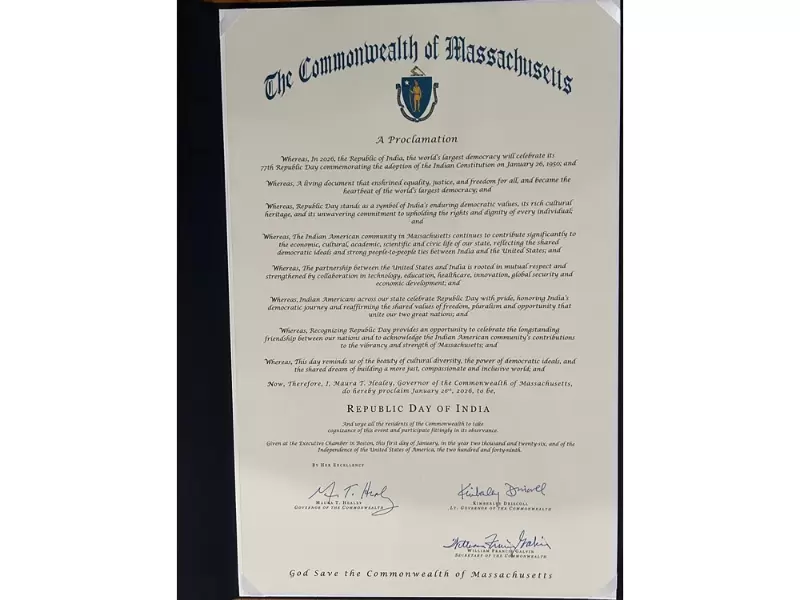 The proclamation recognizes India’s democratic legacy and acknowledges the contributions of the Indian American community to Massachusetts’ civic and cultural life.