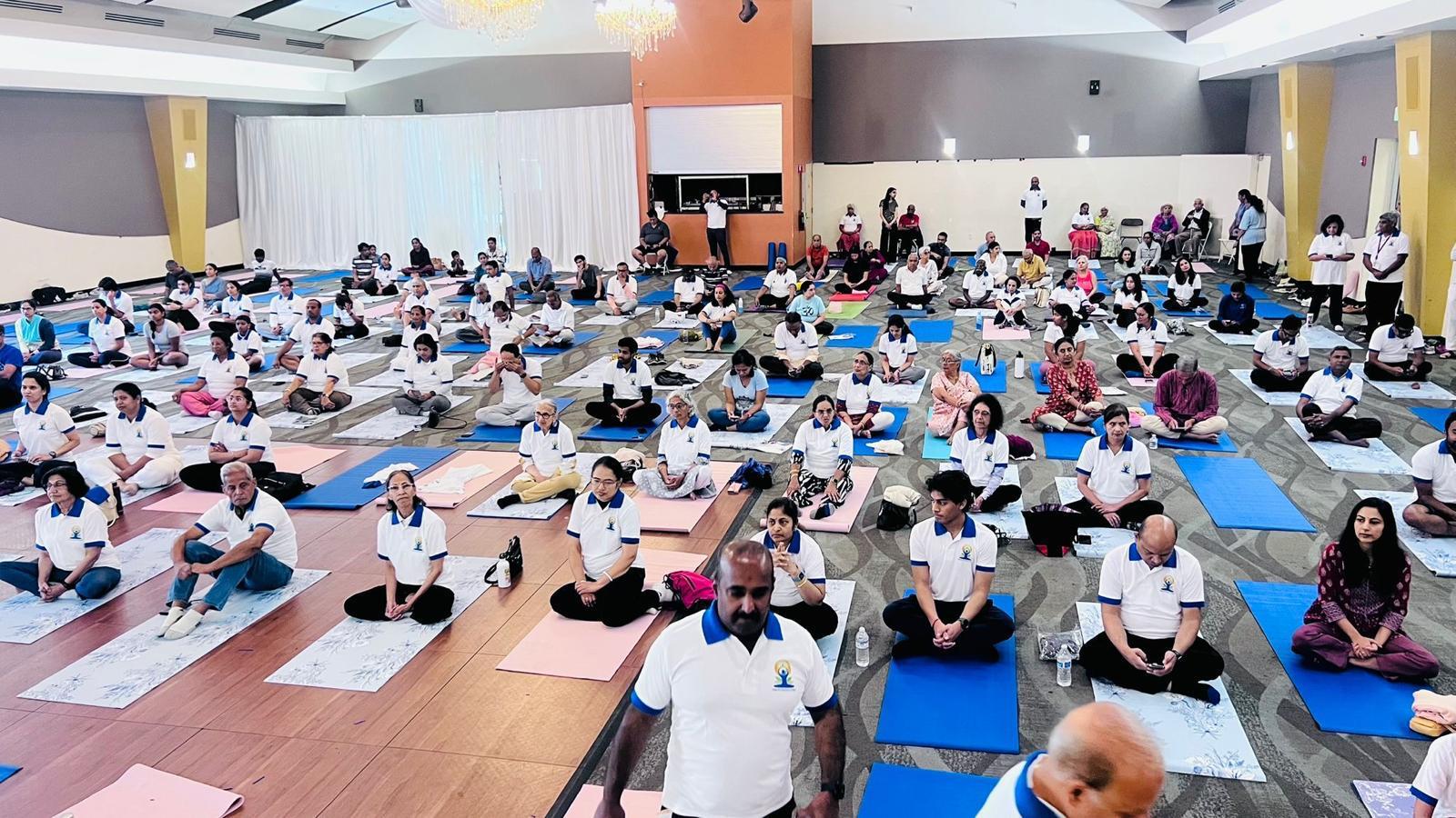 The event hosted in collaboration with the Association of Indo Americans (AIA), and the India Community Center (ICC), was themed "Yoga for One Earth, One Health”.