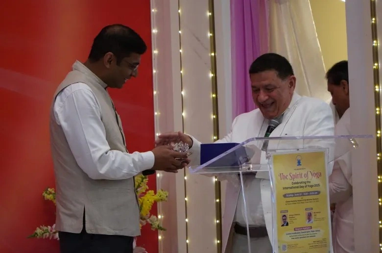 Parveen Chopra presented a crystal lotus to Piyush Singh, who represented the Indian Consulate in New York. / Kripa Ranjan Prasad, courtesy of Parveen Chopra/ALotusInTheMud.comIndia’s Consul General in New York, Binaya Srikanta Pradhan, who was the chief guest was represented by Piyush Singh, consul for press, information, and culture. Delivering the consulate’s message, Singh said, “The energy and intent that radiate from this gathering truly reflect the deeper essence of yoga. Not merely asanas, yoga is a profound spiritual discipline that harmonizes body, mind, and soul.”