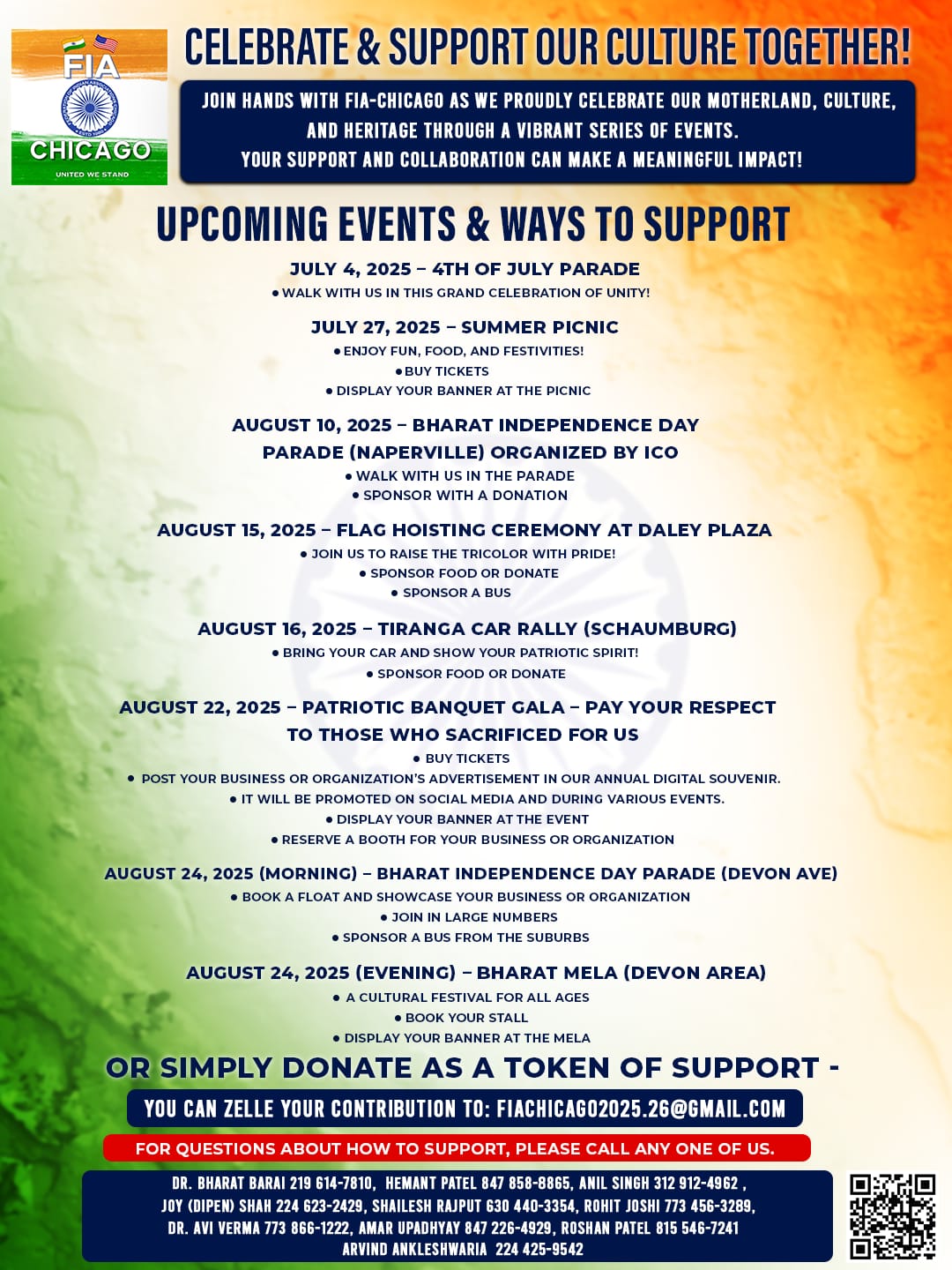 This is followed by a Summer Picnic on July 27, featuring food, games, and banner displays. On August 10, FIA joins hands with ICO for the Bharat Independence Day Parade in Naperville, inviting community members to walk in the parade or sponsor the event.