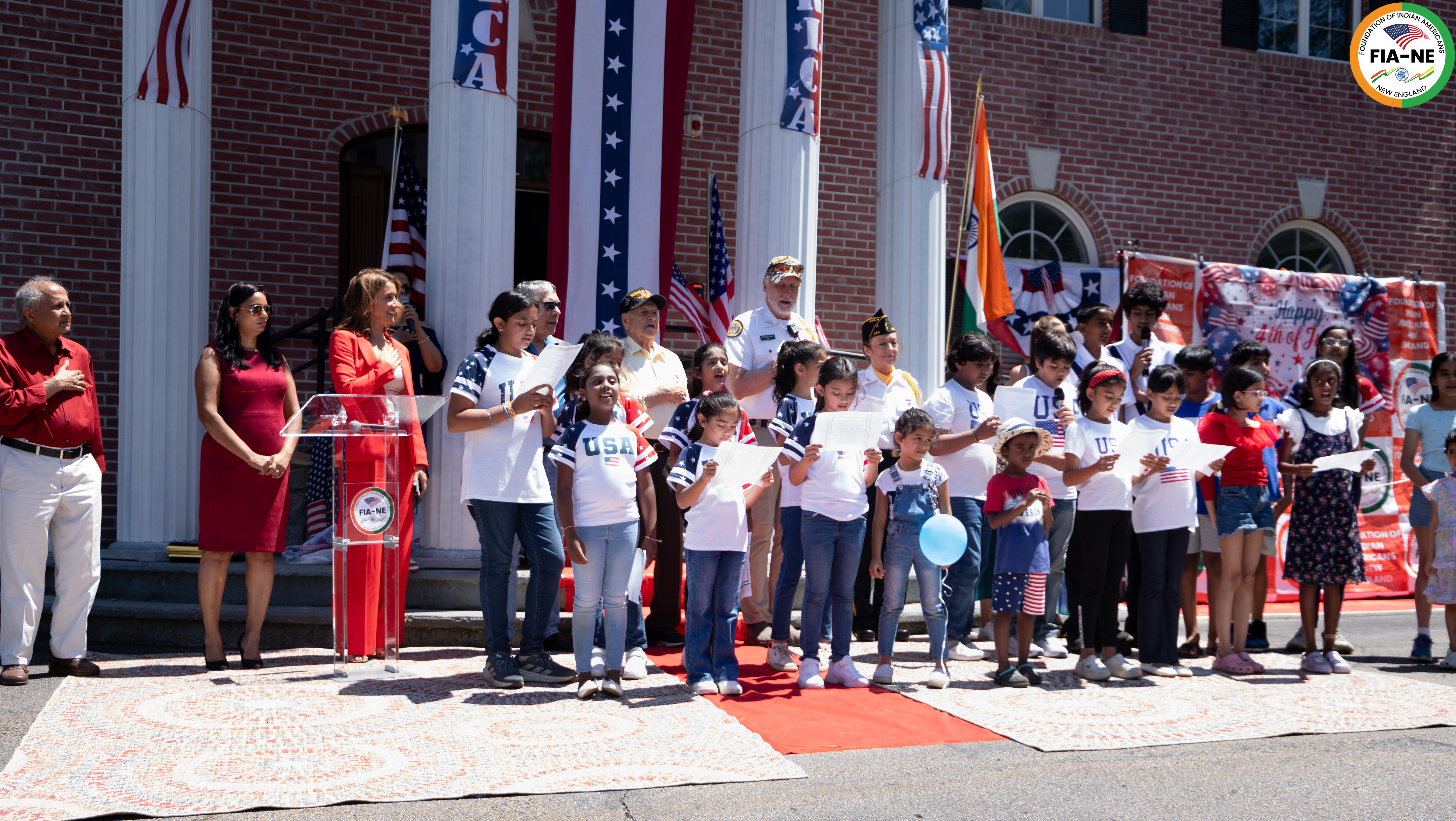 The celebration opened with Jyoti Singh of FIA-NE welcoming attendees, while U.S. military veteran and 9/11 survivor Maggie Lemay emceed the proceedings. FIA vice president Sanjay Gokhale led the Pledge of Allegiance, followed by a heartfelt national anthem performance by children from Padamini Dance Academy and a local band.