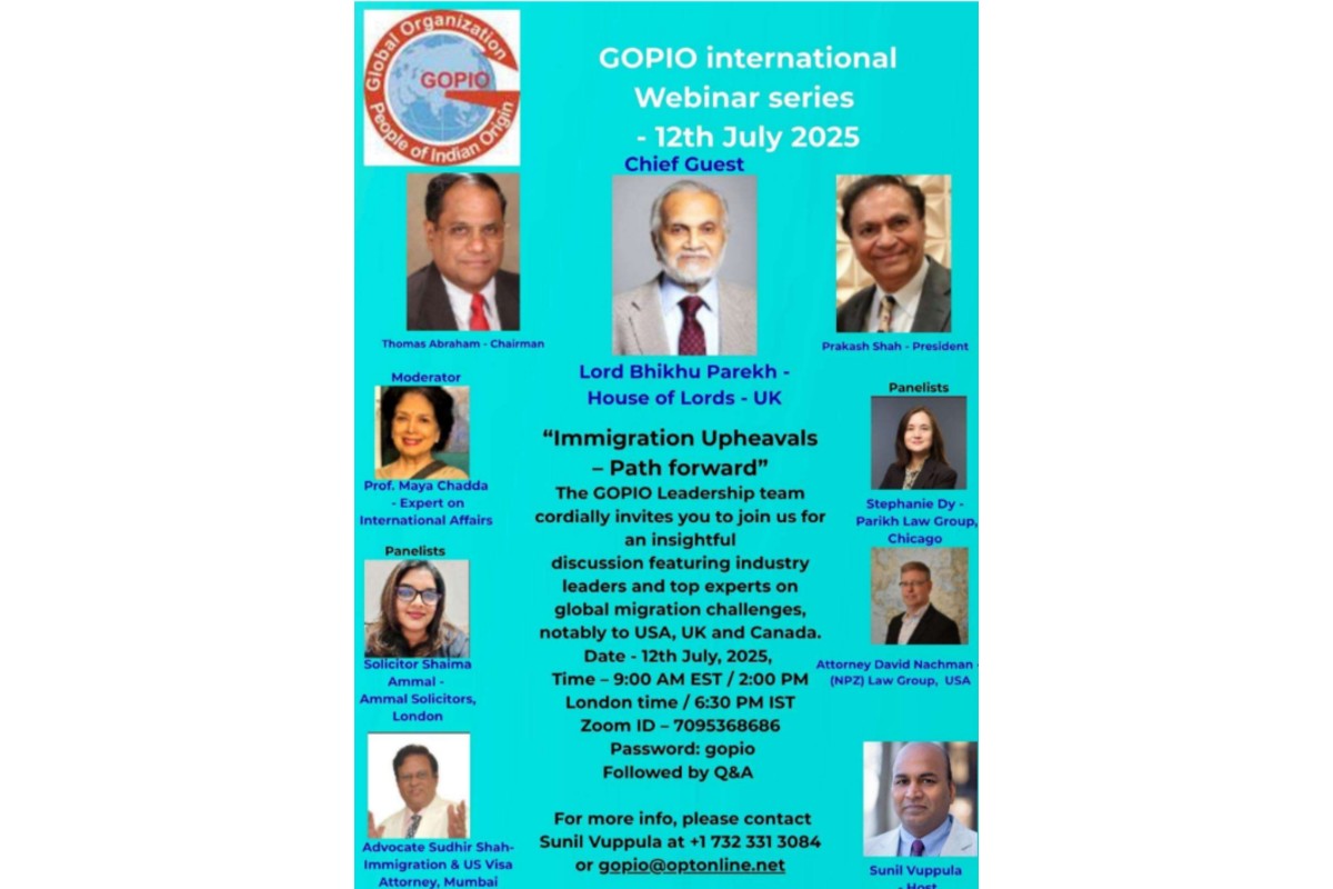 Scheduled for 9 am ET /6 am PT (2pm UK, 3-5 pm across Europe, Africa & Middle East, 6:30 pm in India and 11 pm in Australia and July 13 at 1 am in New Zealand), the event will feature a panel discussion on 'Indian Diaspora and Immigration Upheavals - Path Forward'.