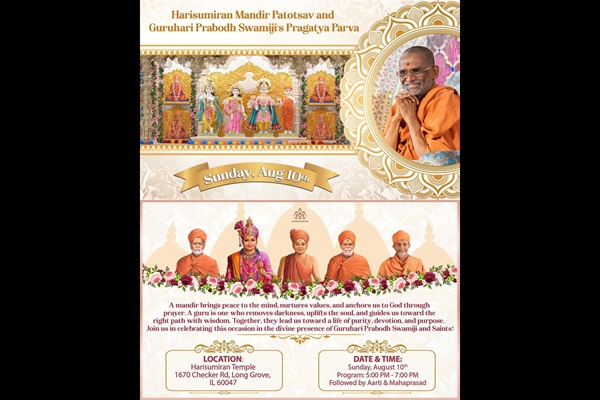 The Harisumiran Hindu Swaminarayan Temple in Long Grove, Illinois, is set to host a grand spiritual celebration on Aug.10, marking its 2nd Mandir Patotsav and the Pragatya Parva (birth anniversary) of Guruhari Prabodhswamiji Maharaj.