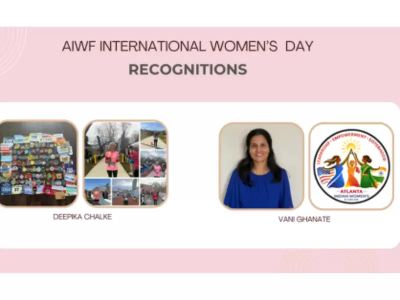 Special honors were presented to Deepika Chalke for completing marathons across all 50 U.S. states and Vani Ghanate for designing the AIWF logo, with awards presented by Veena Rao.
