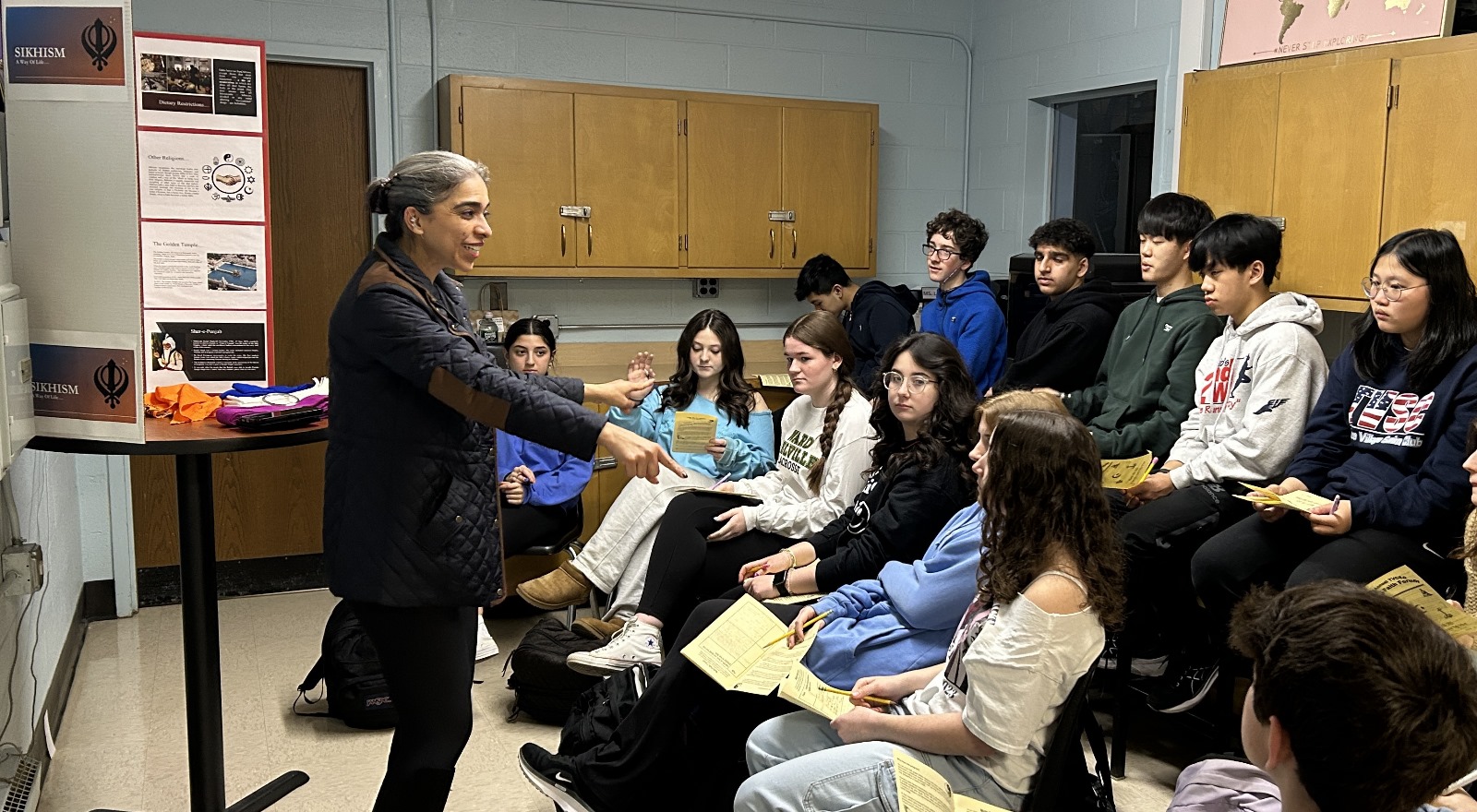 Anu Bindra presented on Sikhism in the schools. / Parveen ChopraDuring his presentation to each group, Chopra shed light on the basics of Hinduism and educated students on sacred symbols such as Om and Swastika, including how to distinguish it from the Nazi Hakenkreuz.
