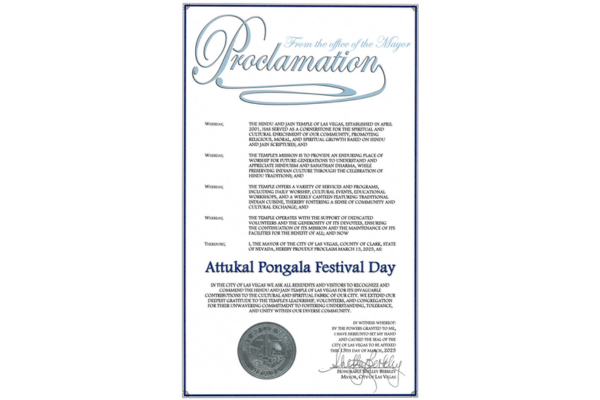 The proclamation designates March 13, as "Attukal Pongala Festival Day" in Las Vegas and recognizes the contributions of the Hindu and Jain communities in the city.