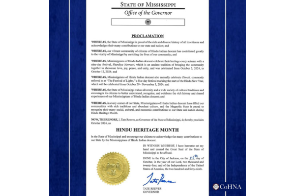 Mississippi Governor Tate Reeves also issued a proclamation, affirming the state's appreciation for its Hindu community. He praised the contributions of Mississippians of Hindu Indian descent, particularly during the nine-day Shardiya Navratri festival and the upcoming Diwali celebrations from October 29 to November 3. “From our family to yours, Happy Diwali,” Reeves said, adding that the Hindu community has enriched Mississippi with their vibrant traditions and accomplishments.