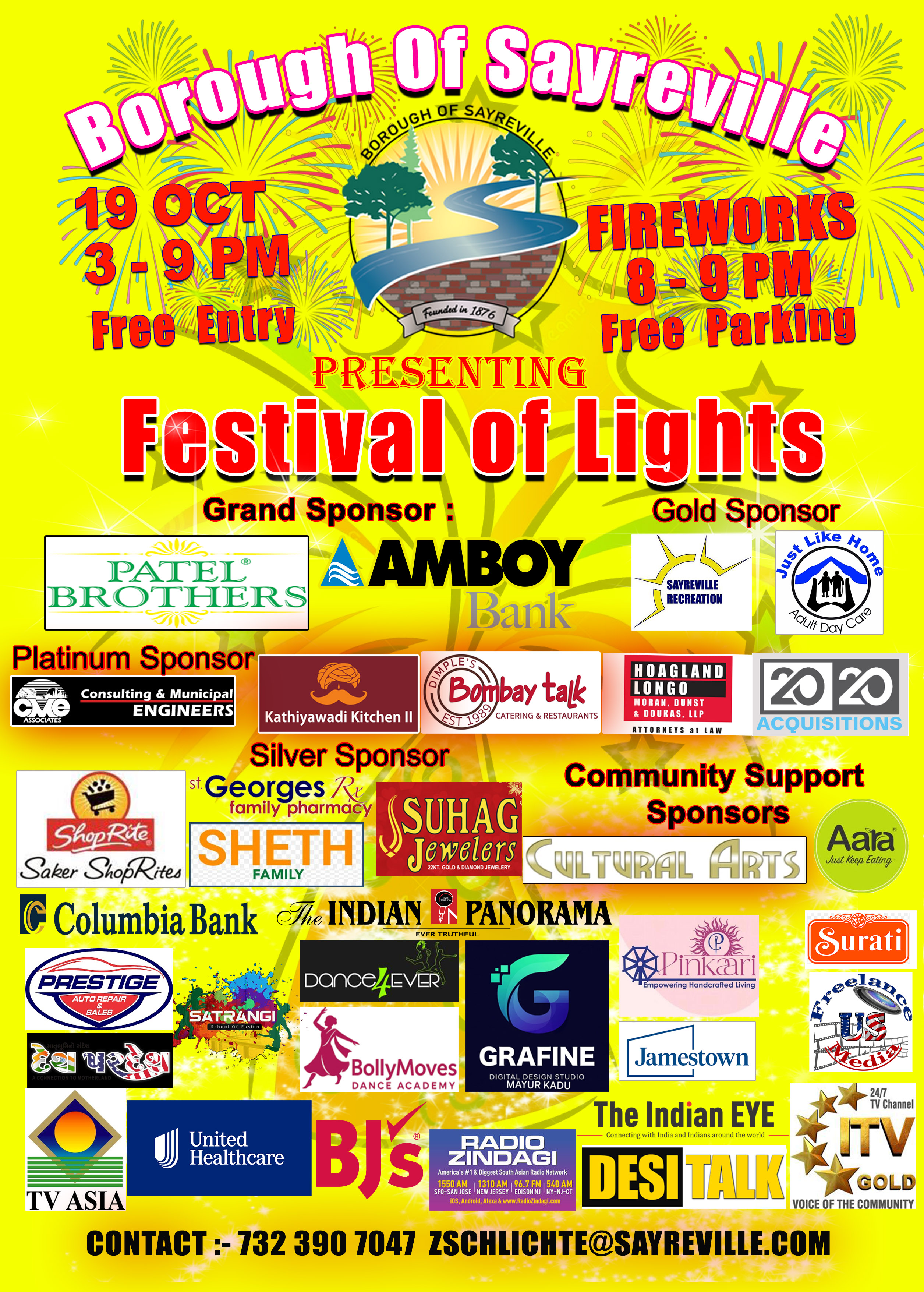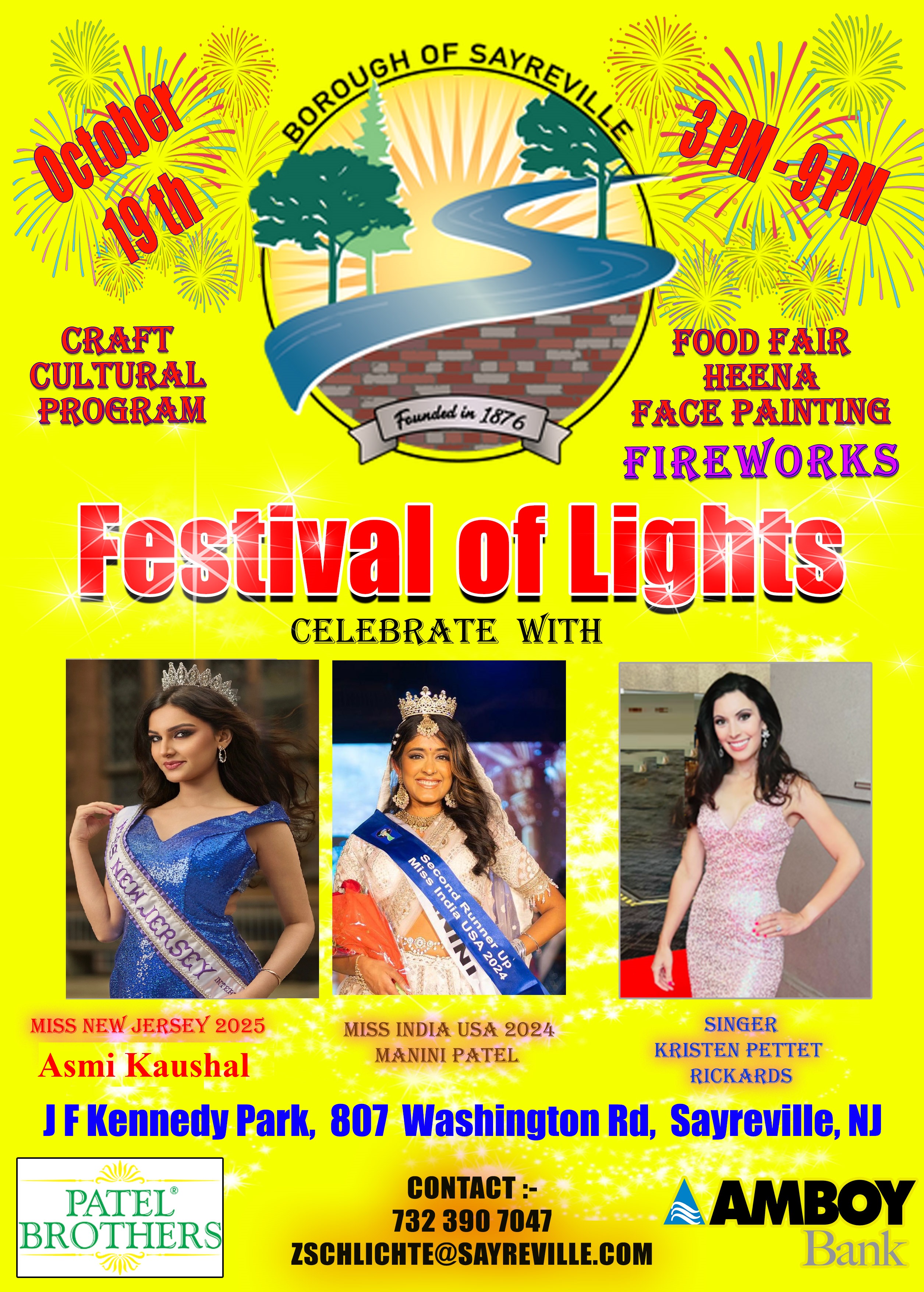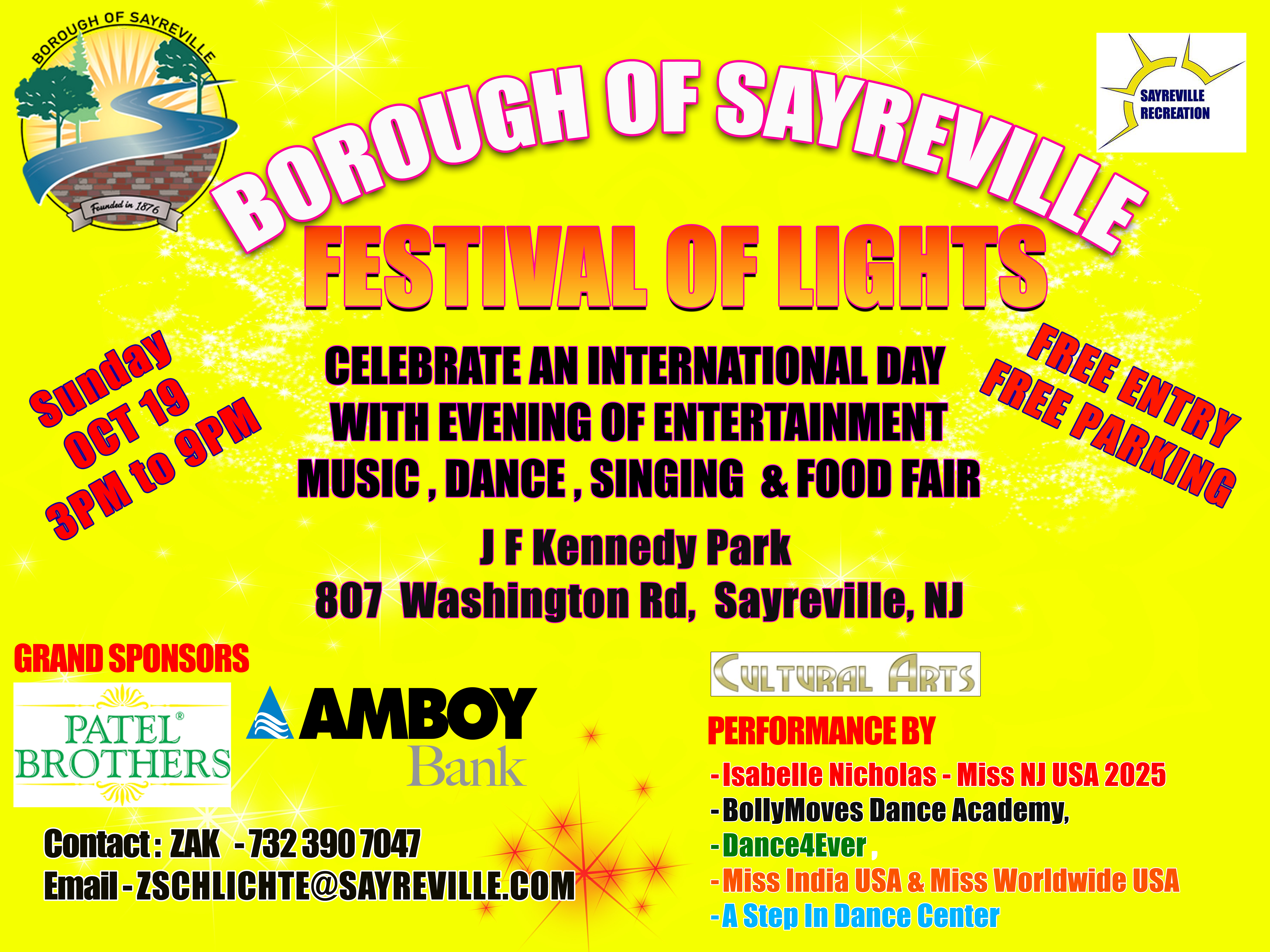 The Borough of Sayreville will host its annual ‘Festival of Lights’ on Oct. 19, 2025, at J.F. Kennedy Park, 807 Washington Road, from 3 p.m. to 9 p.m.