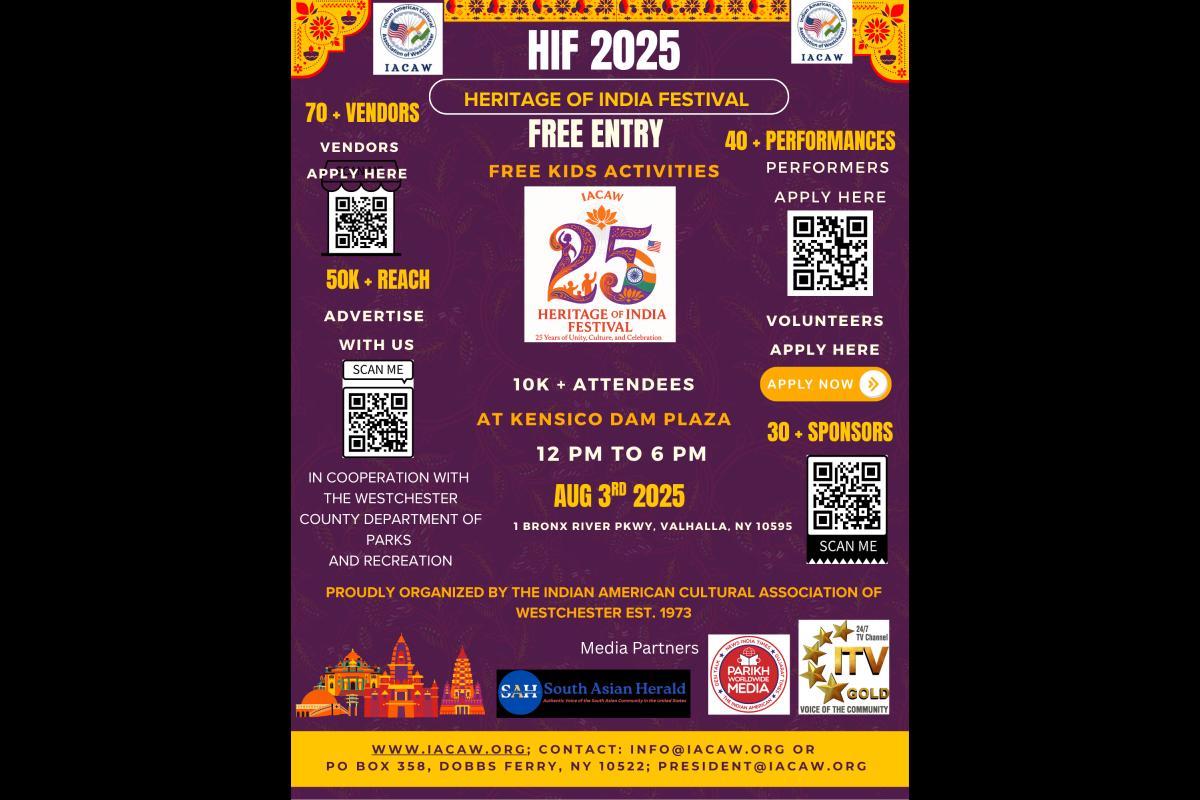 Indian American Cultural Association of Westchester (IACAW) would be celebrating the 25th edition of the Heritage of India Festival on Aug 3 in Valhalla, New York.